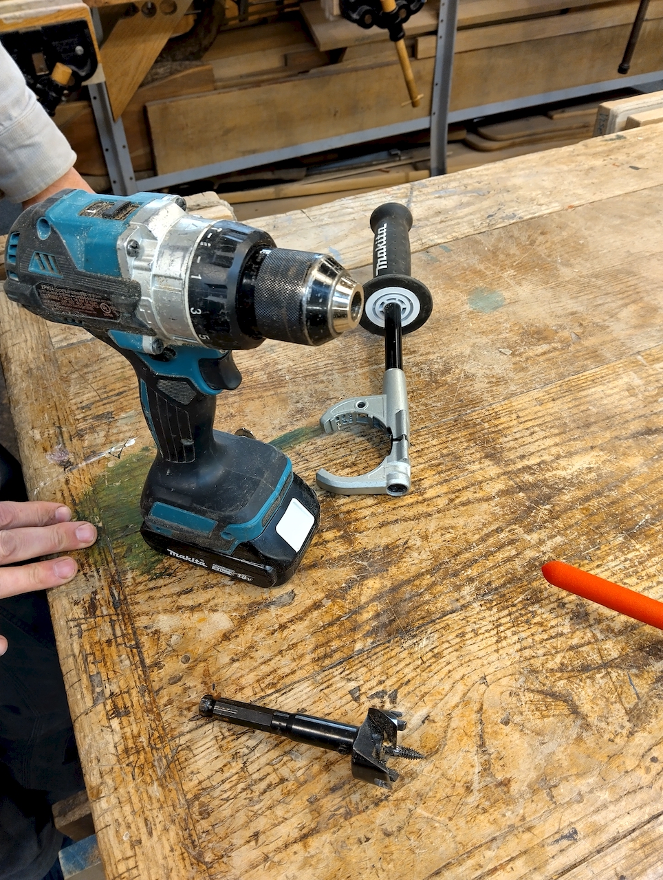 A cordless drill and a torquer mitigating handle are a must when drilling wide holes or forming tenons.