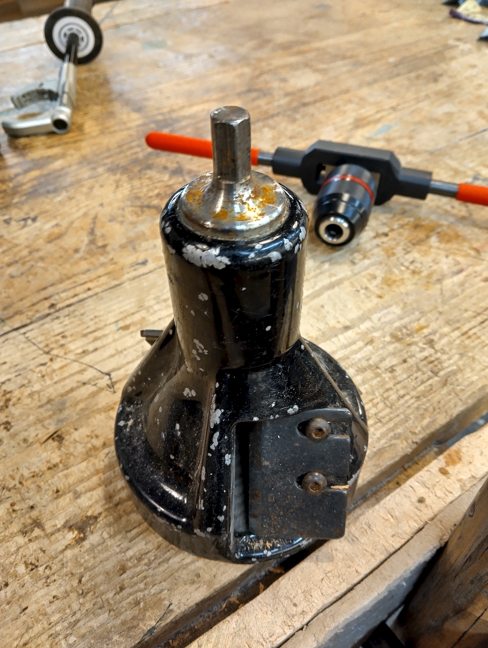 My solution involves a pairing of two off-the-shelf tools: a tap handle and a keyless chuck, combined with a specialized Drill Chuck Adapter. This adapter is particularly robust, featuring a square tang at the end—a much more substantial connection than the standard SDS Plus shank. After screwing the adapter into the back of the keyless chuck, I secure it tightly using a small, provided retaining screw (threaded from the interior of the chuck to prevent the adapter from unscrewing), ensuring zero slip. The tap handle then grips this square end, giving students a wide radius to apply the necessary force for controlled drilling. In essence, I created a versatile auger handle with a chuck that can be opened or closed over various drilling tools.