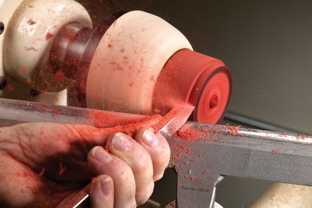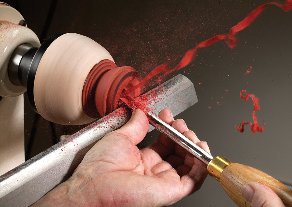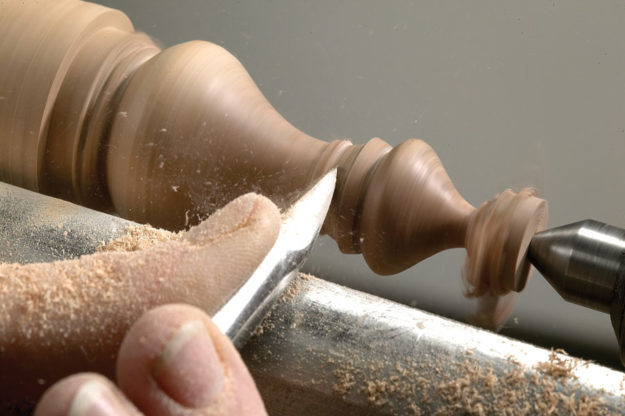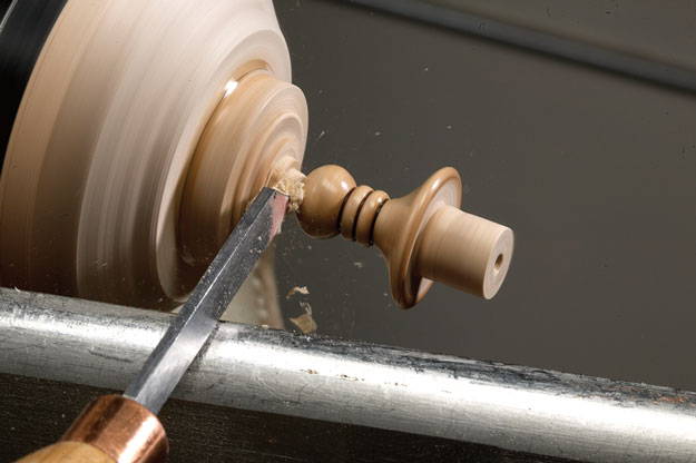 2. Begin shaping the piece, using an appropriately sized spindle gouge. Mine has a long “fingernail” grind; the side of the tool can remove a lot of material, and the tip is good for fine detail.