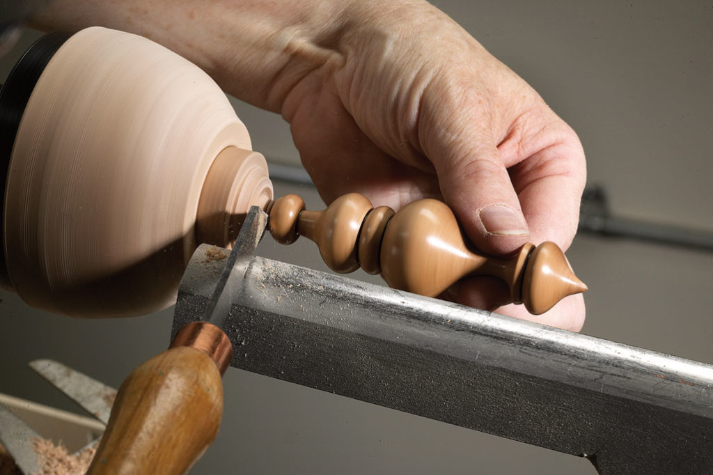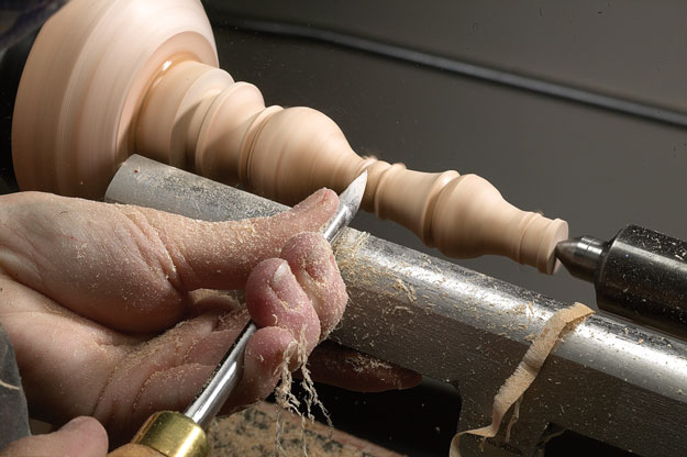 Using a small spindle gouge, begin shaping the ornament. The possibilities here are endless. In general, I find shapes that vary greatly in diameter from one part of the spindle to another are pleasing to the eye. Many people make very angular shapes on spindle ornaments, but I like full, round shapes. Pay attention to transitions; the different parts must relate to one another in some way. And as always, curves must be smooth; make sure there are no bumps or dips in them so the ornament will look finished and harmonious.