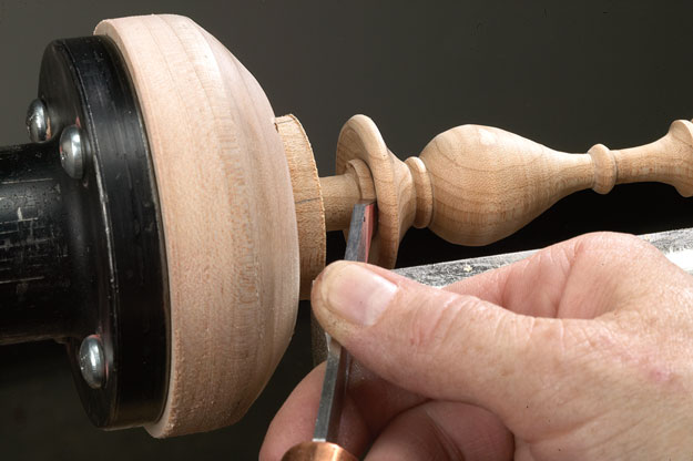 5. Part off the right end, being careful to smoothly complete the shape at the end. Sand and finish the end. Be gentle; too much sideways pressure could pull the piece from the mounting or break it off at a narrow place.