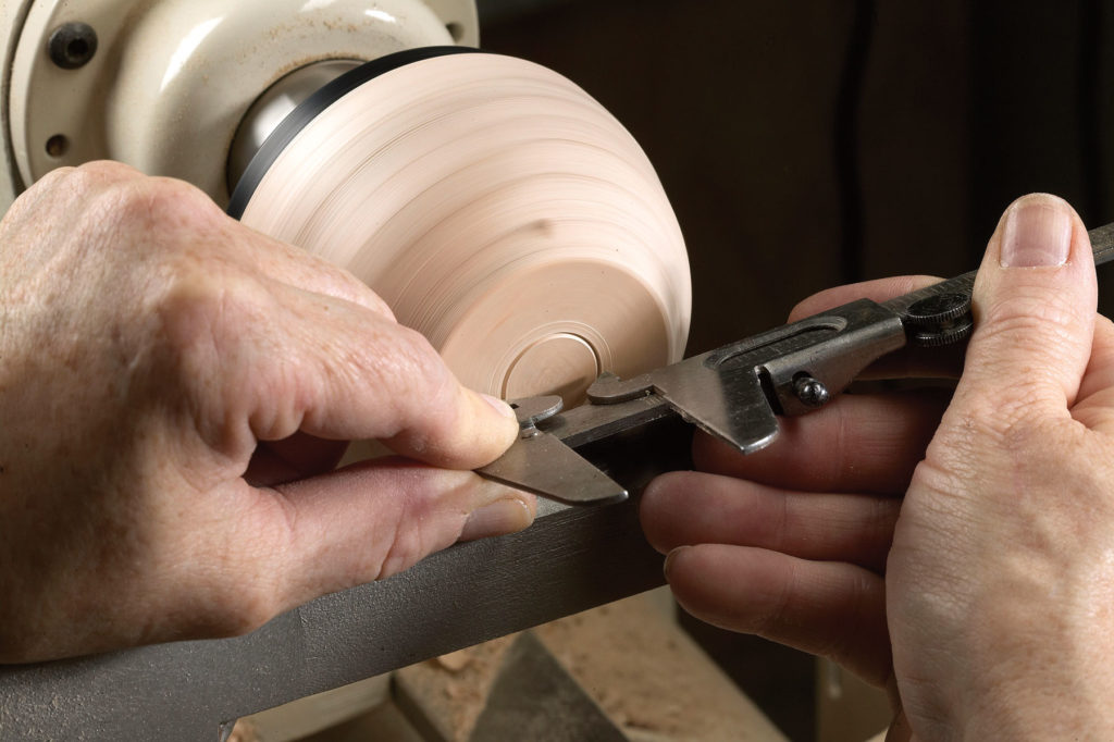 1. Prepare your workpieces by turning them between centers to a cylinder and cutting a slightly tapered round tenon on one end. Mount a waste block onto a faceplate, turn it round and flatten the surface. Measure the diameter of the tenon on the workpiece with a caliper and transfer this to the waste block. With the lathe on, gently touch the left point of the caliper to the waste block. Remember: The wood to the right of center is moving upward; if you touch it there, it can grab the caliper. Make a light mark and move the caliper until the right-hand point lines up with the mark; then push the caliper in to make a deeper mark.