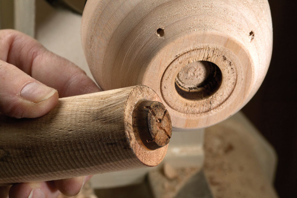 3. After cutting the hole to the approximate size of the tenon, and with the lathe on, firmly grasp the workpiece and push it into the waste block. This will burnish where there is good contact. There should be good contact at the outside of the cylinder and at the tenon, as shown here. An important caution: If the fit is too tight, or the hole is shorter than the tenon, the cylinder can twist and be pulled from your hands. If you are uncomfortable with this method, fit the piece with the lathe off until it’s right. This will take longer, but the workpiece won’t be pulled from your hand.