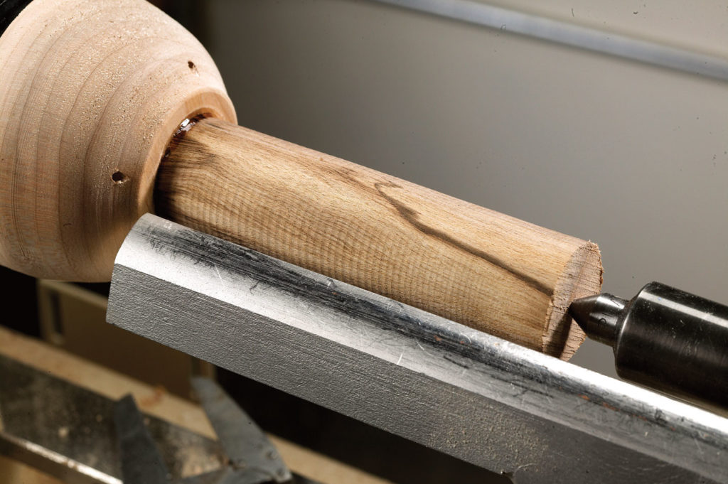 Cut a straight shoulder on the end of the piece and rough in the outside shape. Using the tailstock to mount a drill bit, drill a 12“-diameter hole through the piece into the waste block. With a fingernail-grind spindle gouge, remove most of the wood inside the piece to reduce the weight. Continuing the rough shape you’ve established, part the piece off.
