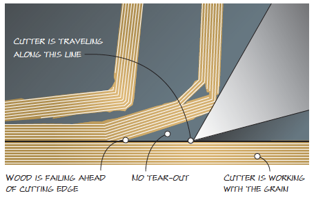 When you have a “Type I” cut and are working with the grain of the board, the wood is levered up ahead of the tool’s cutting edge, but no tear-out occurs because the wood fails above the line the cutter is traveling on.