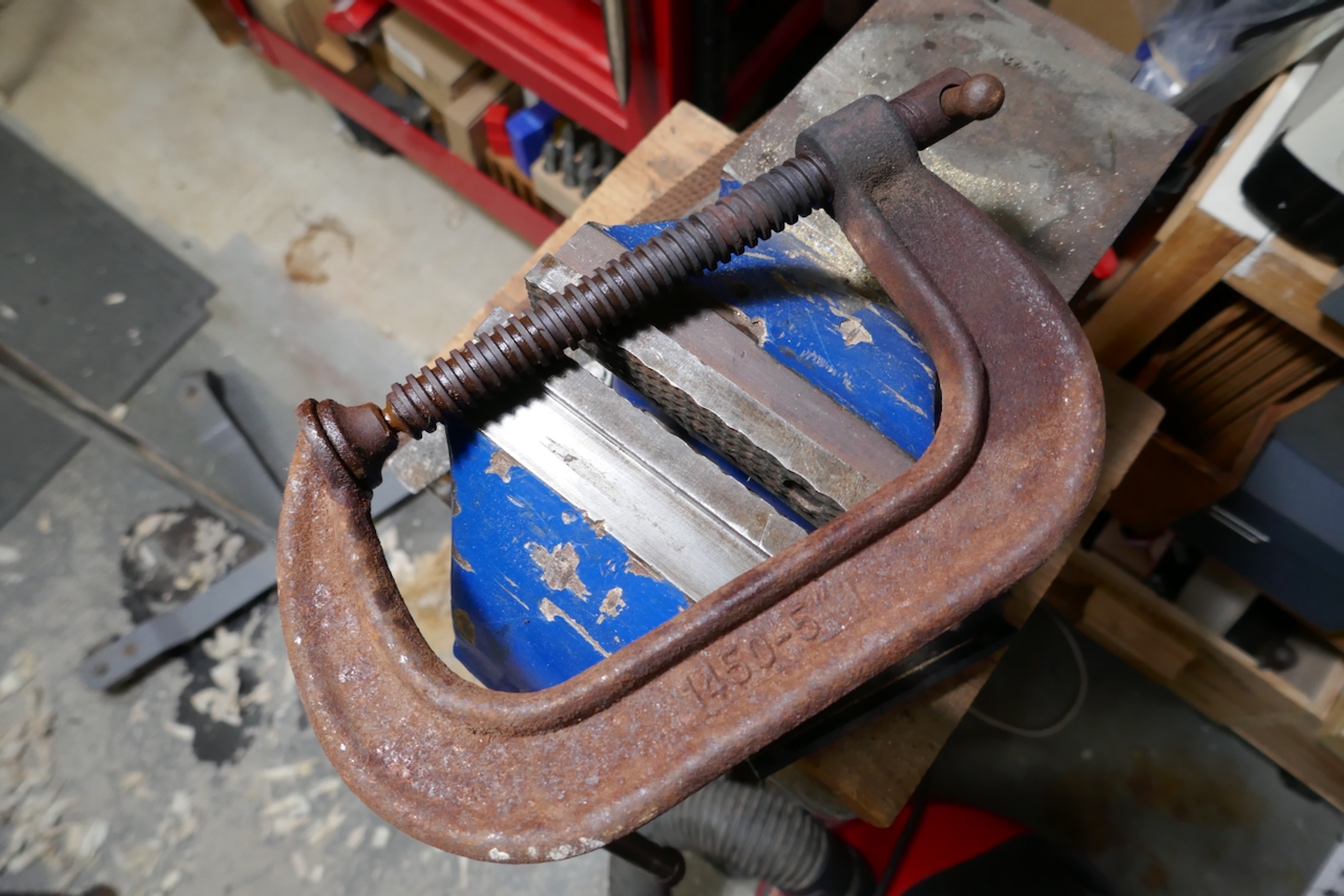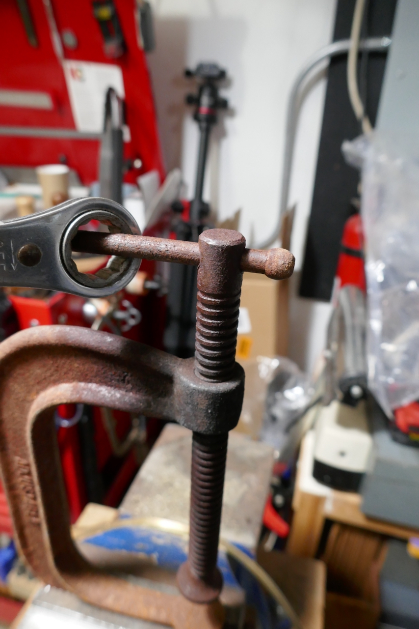 There, under the ladder, sat a bundle of rusted clamps. They were caked in rust and draped with cobwebs — a small graveyard of forgotten tools. Because we’re always short on C-clamps, I suspected what had happened: decades ago, maintenance probably borrowed these from the woodshop for some repair job and never brought them back. So I decided to rescue them.