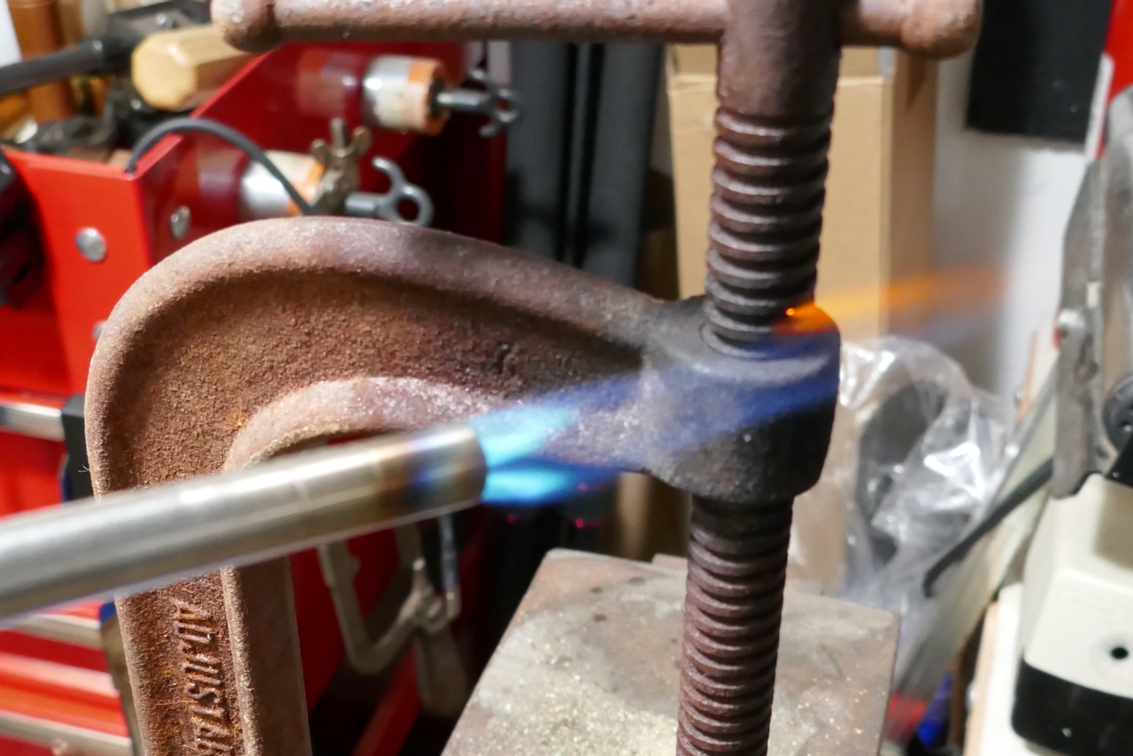 So I told my students I’d take it home and use a different approach. That evening, I secured the clamp in a machinist’s vise — never over a wooden bench — and cleared the area of anything flammable. When using a torch, it’s crucial to work safely; keep the flame away from combustibles and hold your work securely in an all-metal vise. I brought out my small torch and heated the area around the screw — the part of the clamp that had seized — for about a minute or two. Once the metal expanded from the heat, I gripped the screw with a wrench and began to work it back and forth. After a few turns, it started to move. I added another shot of WD-40 and kept working until the screw spun freely again.