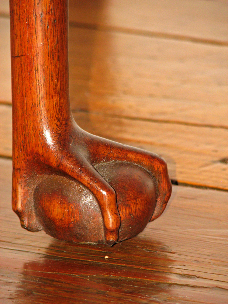 Over on the Chris Schwarz blog, some of the people commenting on his review of Furniture in the Southern Style mentioned one of the photos in the introduction, and the reference to it being a misrepresentation of a ball and claw foot. I thought it would be a good idea to post the photo in question. We didn’t have room for more photos of this piece, and we assumed that the picture was enough to convey the idea without additional text. Perhaps we were too close to the subject and should have explained more about what the staff at MESDA referred to as “the Chicken Foot table”. As you can see, this is a good attempt at a ball and claw foot, but it is unusual in its form. To be specific, the leg is too straight to gracefully form the foot, and the ball is far from round, looking a bit squashed under the weight of the leg.