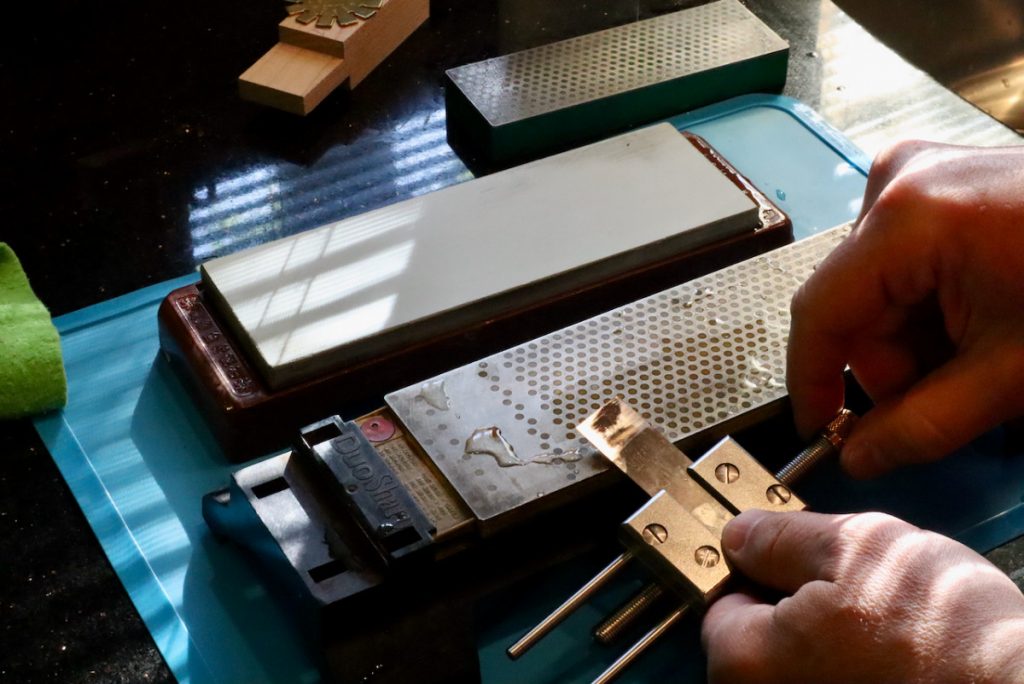 Lapping the Richter chisel’s back on a 600 grit diamond stone.