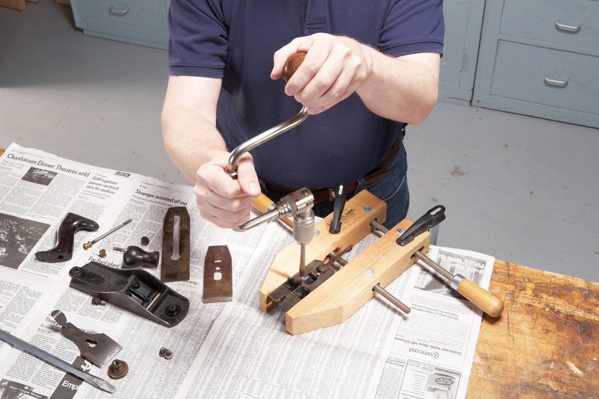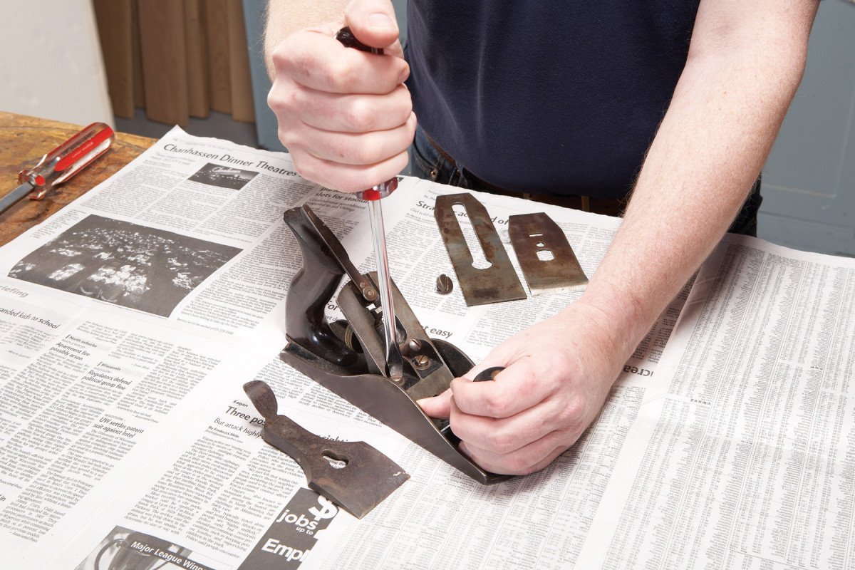 First, take the plane completely apart. As you disassemble it, count and keep track of the parts–particularly the screws. They may have special threads, and often can’t be replaced by hardware-store screws.
