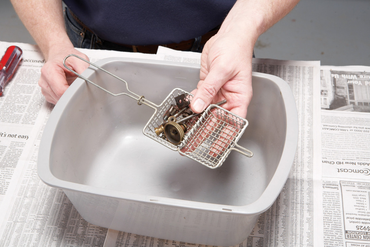 Degreasing agents are corrosive, so wear rubber gloves and work in a well-ventilated area. Spray all of the parts with degreaser and allow them to sit for a few minutes (Photo 4).