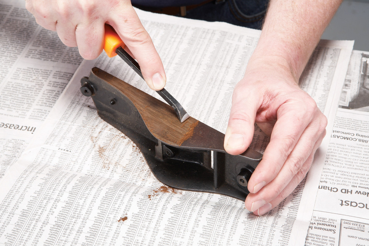 7. Turning to the plane’s body, scrape off rust and tarnish with a de-scaling tool. I use a hardware-store pry bar whose end is beveled and sharpened.