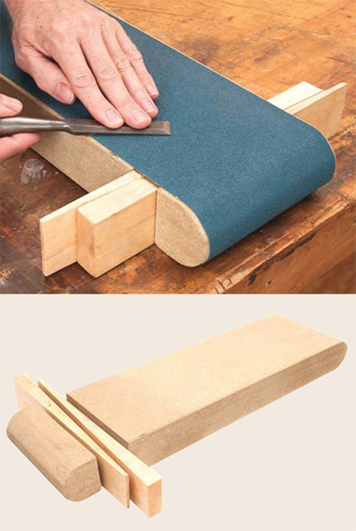 You can chew up a lot of sandpaper flattening a plane iron, a large chisel or the bottom of a plane. It makes sense to use paper that lasts a long time–like a sanding belt. But, if you cut a belt to lay open, it won’t sit flat, because its backing is too stiff.