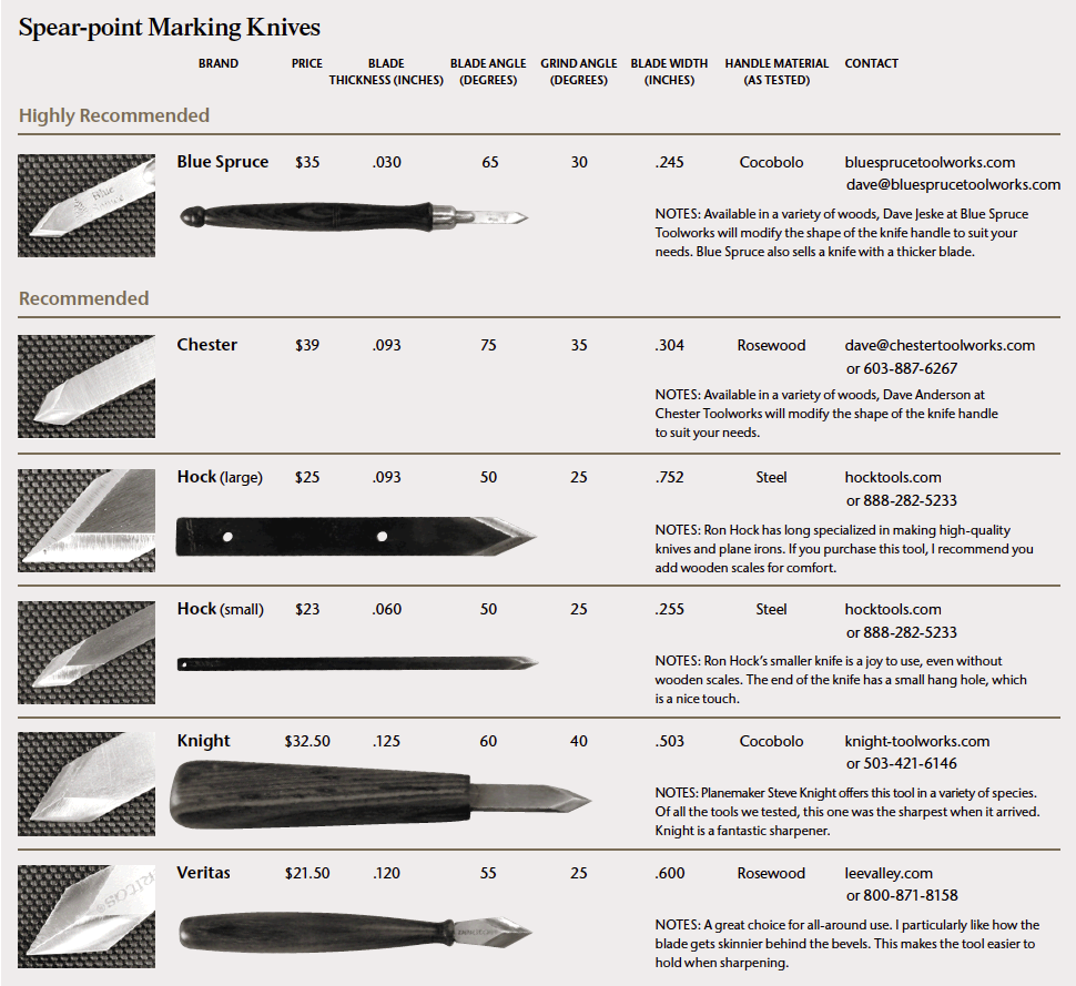 For me, marking knives are an item of some intimacy, and so I gravitate toward tools made by people you can call on the phone and talk to personally. After six months of shop time, I can say that I like all of these knives, though each has quirks and limitations. This review should help you sort out the best one for you.
