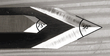 ■ Blade Angle: This is the angle of the spear point. Larger angles (such as the 75° tip of the Chester Toolworks knife) make a better line when the tool is nearly upright to the work. Smaller angles (such as the 50° tip of the Hock knives) cut better when pitched lower. This is an important difference. Larger blade angles are better for marking dados and tenons using a square because you want to deeply score both the near and far corners of your work to make it easy to carry the line around the workpiece. A larger blade angle cuts these corner marks without you having to radically angle your wrist.