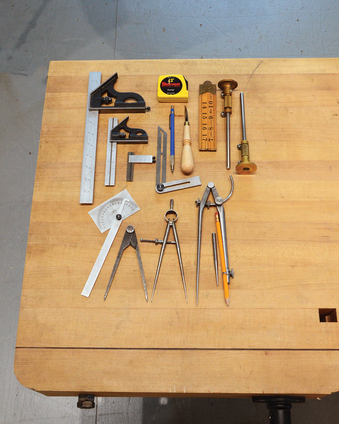Two sets of dividers, and a compass allow for curves, and also let you lay out proportions and transfer points onto your stock. Two marking gauges allow you to transfer multiple dimensions without needing to measure. With a folding rule and tape measure, you can take specific measurements. The blade from your 12″ combo square can be a straightedge when needed.