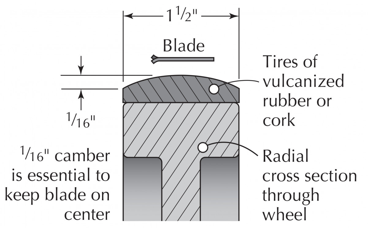 We “turned” the surface of the tires, in the machine, with a large wood turning scraping tool (no blade on the wheels, of course). The surface of the vulcanized rubber was trued and the vital 1⁄16” camber across the width reinstated. Having taken the blade off, the bottom wheel was turned under power, with a jerry-rigged tool rest, and the top wheel was done with my students supplying human power. I am certain that these operations aren’t recommended on safety grounds; fortunately, most band saw tires already have this camber.