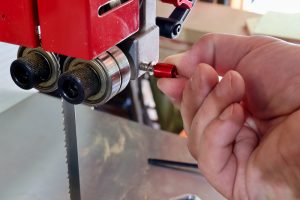The ones I decided to buy were the red-handled rotating knobs with a single wing (aka, adjustable thumb lever screw and threading rotating knob). These are very convenient thumbscrews that are perfect for locking the blade’s bearing rotation screws (or cool blocks in some bandsaws). The winged screws’ adjustable knob is spring-loaded, which allows it to be pulled out and repositioned into a more friendly angle. This feature is very important as it prevents the screw from becoming an obstacle to material that travels underneath it.