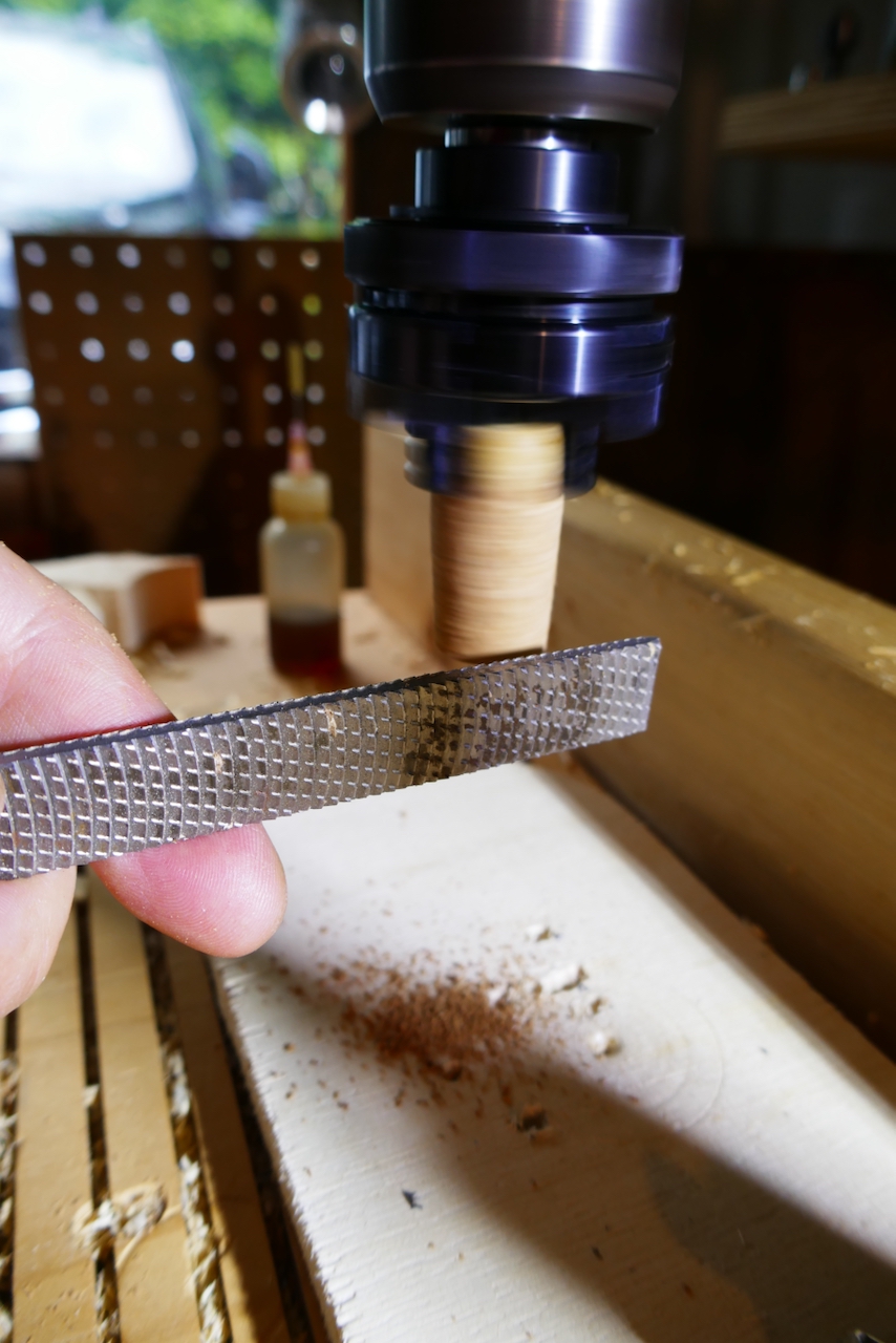 Most of us already use the drill press to gently shape smaller diameter objects, provided they can fit in the machine’s primary chuck. This usually limits us to objects with a maximum diameter of about half an inch, or 5/8″ at the very most. When using the drill press this way—and I’m not talking about using aggressive lathe gouges, but rather using a rasp to round over a knob, or files and sandpaper to smooth hardware pieces or reduce the diameter of a dowel—our options are limited by that chuck capacity.