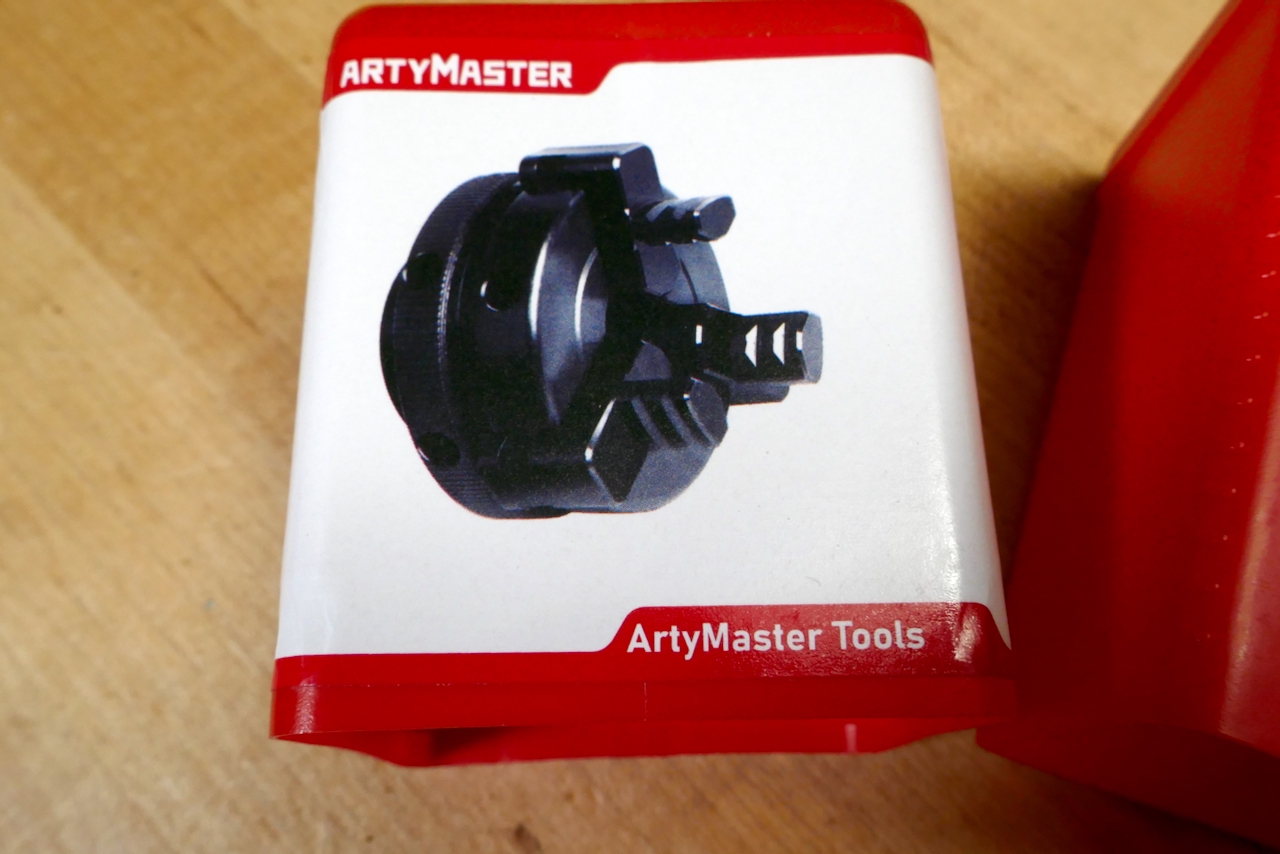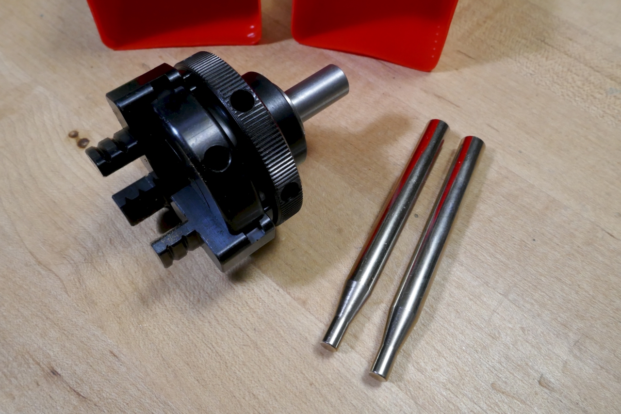 The jaws of this auxiliary chuck can be opened using two rod-style chuck keys to a significant diameter. You then use these rods in a reverse manner to securely tighten the chuck over your workpiece.
