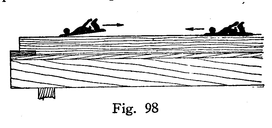 Bringing the Plane Back.–Early in the author’s experience as a carpenter, the foreman put him to jointing board. After a while the foreman happened along, and remarked with a grin, “I notice you sharpen your plane on the return trip.” Then he went on to explain that if the tool is pulled back over the edge of the board, the heel of the plane should be lifted, otherwise the return trip would dull the plane bit, rather than sharpen it.