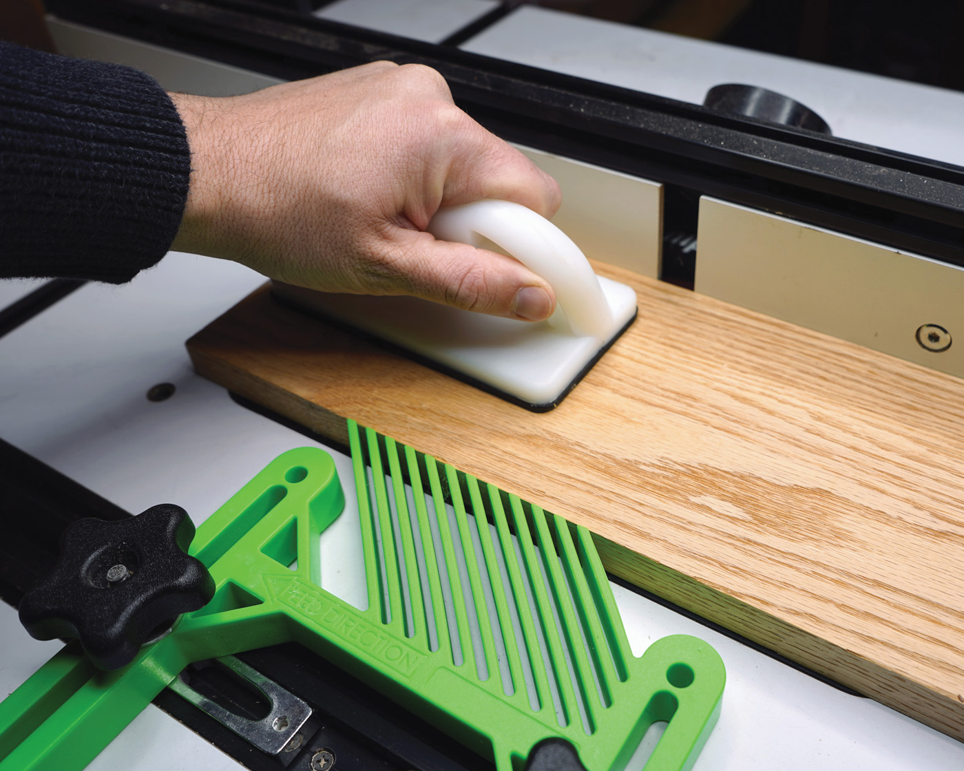 9 Using a featherboard ensures a tight fit to the fence and leaves both hands free for feeding the board and a push pad.