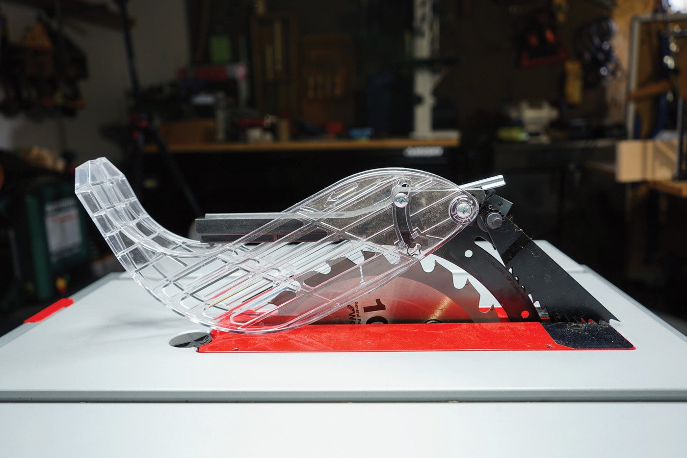 8 This blade guard floats above the table and sucks dust away. It also means I can use accessories like a miter gauge with the guard in place.