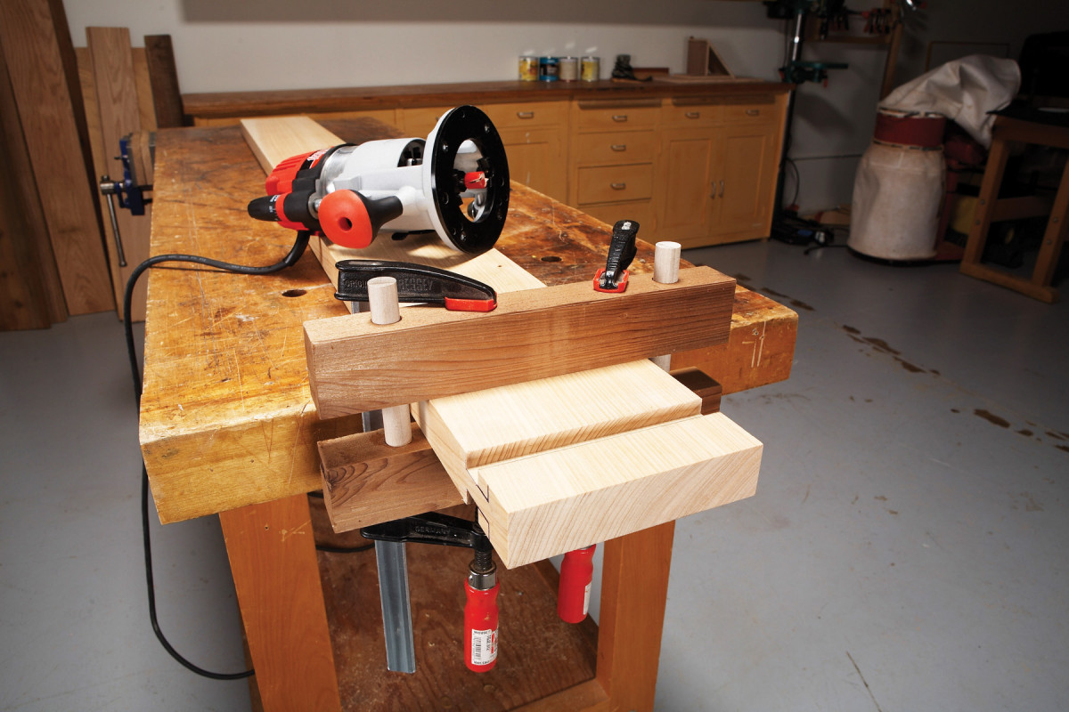 Let’s say you’re building a bed or dining table that requires very long rails. Cutting tenons on those rails can be unwieldy using a tablesaw, but it’s quite easy using a router and a set of parallel guide blocks. The guide blocks are just two large pieces of wood connected by a pair of alignment pins.