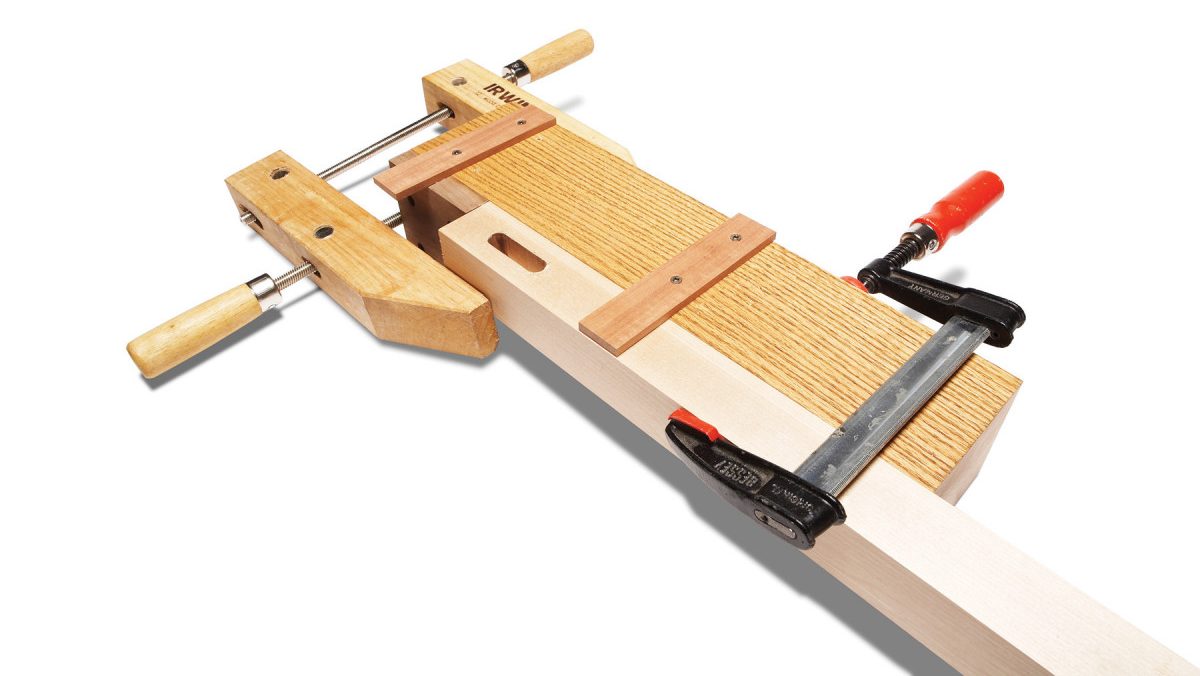 First, clamp a 3-to 4-in. square block to your bench. Fasten a 5-in.-long stop block to its side, near one end. Butt your workpiece up to the stop block and clamp your workpiece to the large block. (A large handscrew is ideal for this job because it has a deep reach.)