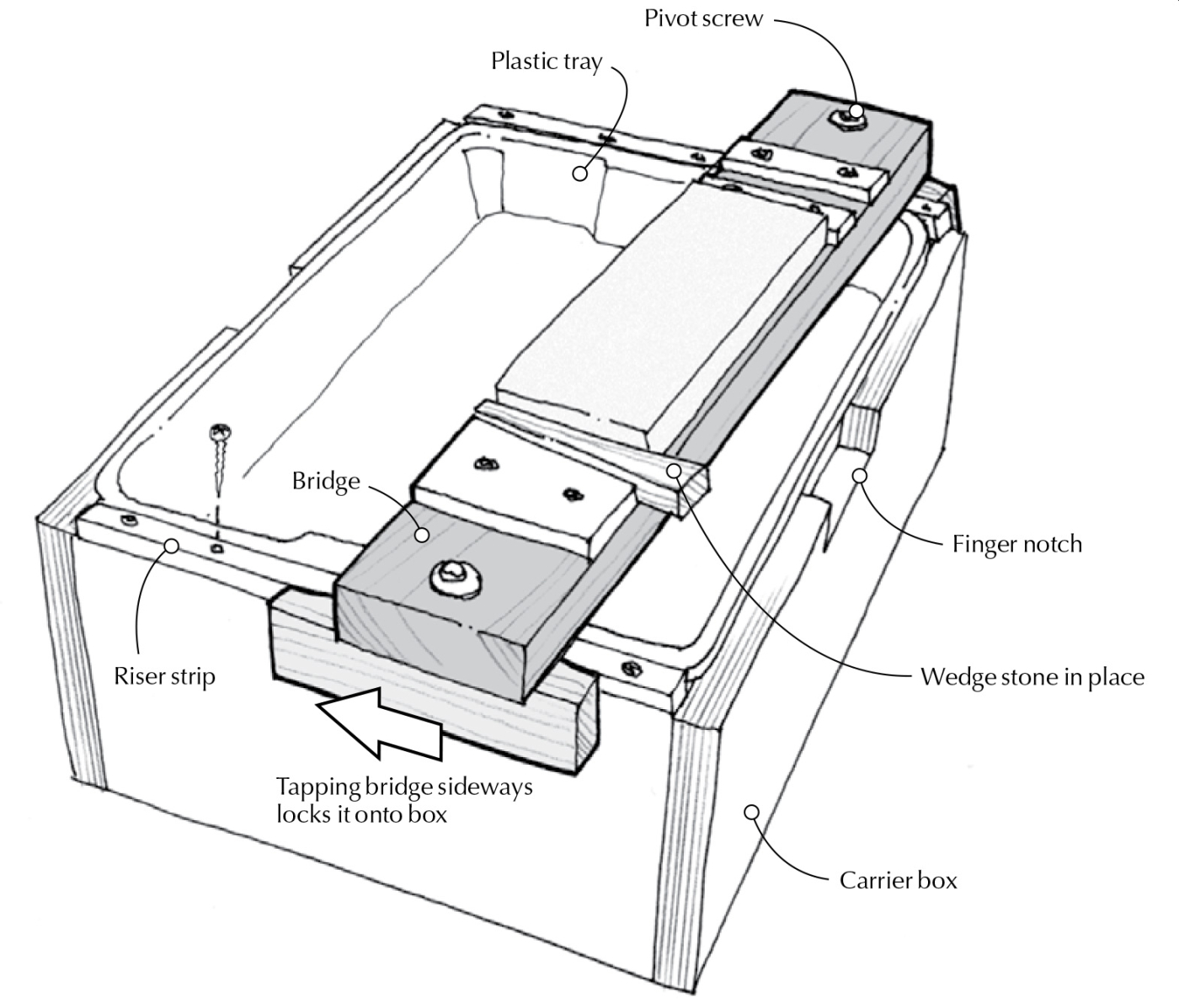 I made the bridge from 5/4 quartersawn hardwood, finishing it heavily. I attached hardwood cleats to each end with a single, centered pivot screw. The cleats are spaced about 1⁄16” wider than the box length to create a tight grip on the box sides when the bridge is knocked sideways at one end. A simple cleat and wedge system atop the bridge holds a stone securely and allows an easy release — Rob Porcaro