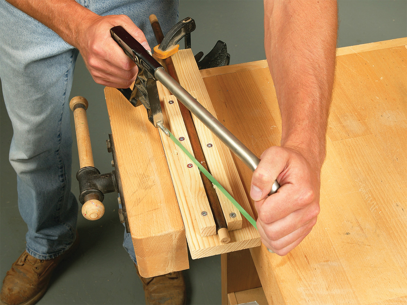 1 Make a scarf cut, slicing the part in two. A fine-tooth dovetail saw is perfect for the job, but a fine hacksaw blade also leaves a clean cut with almost no tear-out.