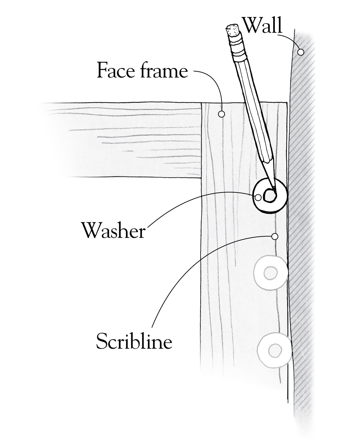 While on the job site and installing cabinets, I was preparing to scribe a face frame to fit against an irregular wall when I realized I forgot to bring my compass. I was wondering if I had time to go retrieve it when I remembered that an old finish carpenter once showed me how to scribe using regular hardware washers, which I always seem to have on hand. I tried it, and it worked well.
