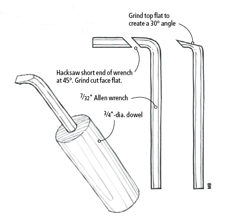 When mortising I found it difficult to remove waste left at the bottom of the mortise by my hollow-chisel mortising bit. Prying it out with a bench chisel often damaged the shoulder of the mortise and was not kind to the cutting edge of the chisel. I needed a tool with a right-angle cutting edge that would allow me to scrape the bottom of the mortise right up to the corners, then pull the chips out. I figured out how to make one from a 7⁄32″ Allen wrench. Here’s how: