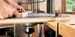 Glue the bottom piece of 1/4-in. hardboard to the plywood core. Then use your router’s base plate to trace the hole for the base. Cut the hole with a jigsaw and glue on the top piece of 1/4-in. hardboard. Add the plastic laminate to complete the “sandwich.” Use the router base to locate the screw holes. Drill these holes and countersink them from the top. Add a 1×2 cleat to the bottom of the table about 3 in. from the back edge. The cleat helps brace the table against your bench. Finish off the top with a little paste wax.