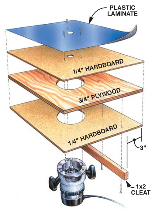 Glue the bottom piece of 1/4-in. hardboard to the plywood core. Then use your router’s base plate to trace the hole for the base. Cut the hole with a jigsaw and glue on the top piece of 1/4-in. hardboard. Add the plastic laminate to complete the “sandwich.” Use the router base to locate the screw holes. Drill these holes and countersink them from the top. Add a 1×2 cleat to the bottom of the table about 3 in. from the back edge. The cleat helps brace the table against your bench. Finish off the top with a little paste wax.