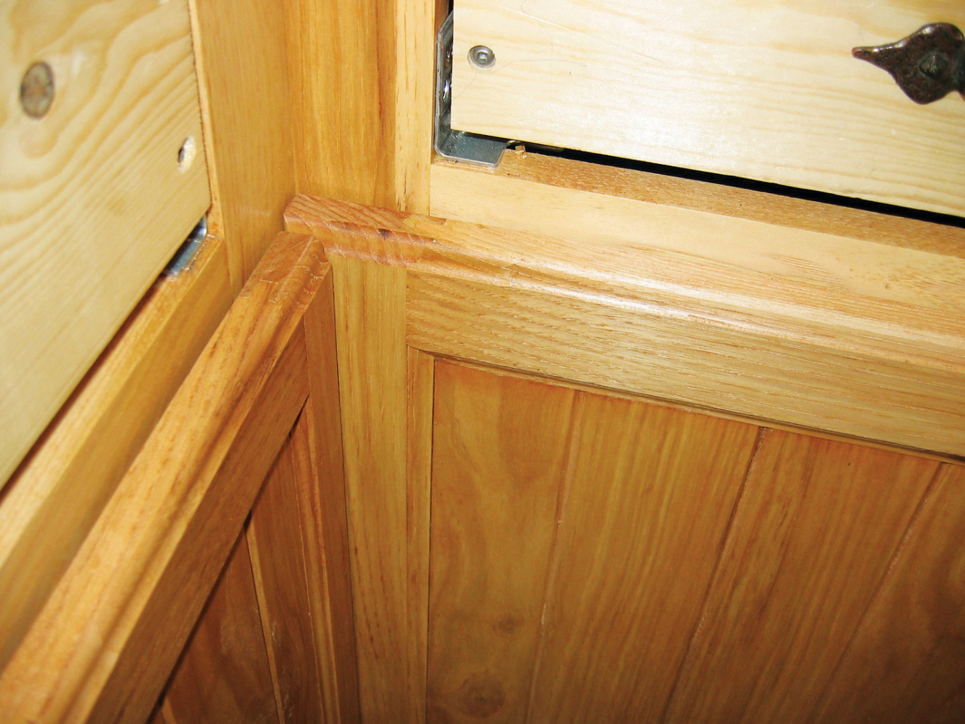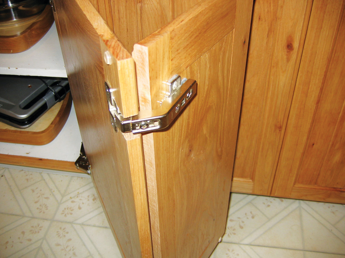 I hated the black hole that appeared when I installed corner bifold doors in my kitchen cabinets. To get rid of this annoying gap, I decided to make the main door (the one with the hinges) 3/4-in. wider, so it would extend behind the second door. This alteration required cutting a pair of 3/4-in.-deep notches in the main door in order for the hinges to work properly (these notches are only visible when the doors are open). I also had to measure from the inside edge of each notch to drill the bifold hinge cup holes.