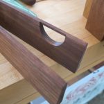 Next, trim the edges. There are various tools available for trimming, but my experience with the ones I’ve used is that they have a tendency to catch in the grain of the edge banding and cause tears. I’ve tried simply flattening the edges with a random orbital sander (lay the panel flat on your work bench, and hold the sander perfectly flat if you’re going to try this) but found it too easy to tear the veneer or even in some cases rip it right off. So in the end, I came up with the simplest low-tech method: I use the same sanding block as I use for the ends of the panel, but now at 45 degrees. As with the ends of the edge-banding, do not rub up and down; rub downward only. Otherwise you risk tearing the grain or even tearing the banding right off.