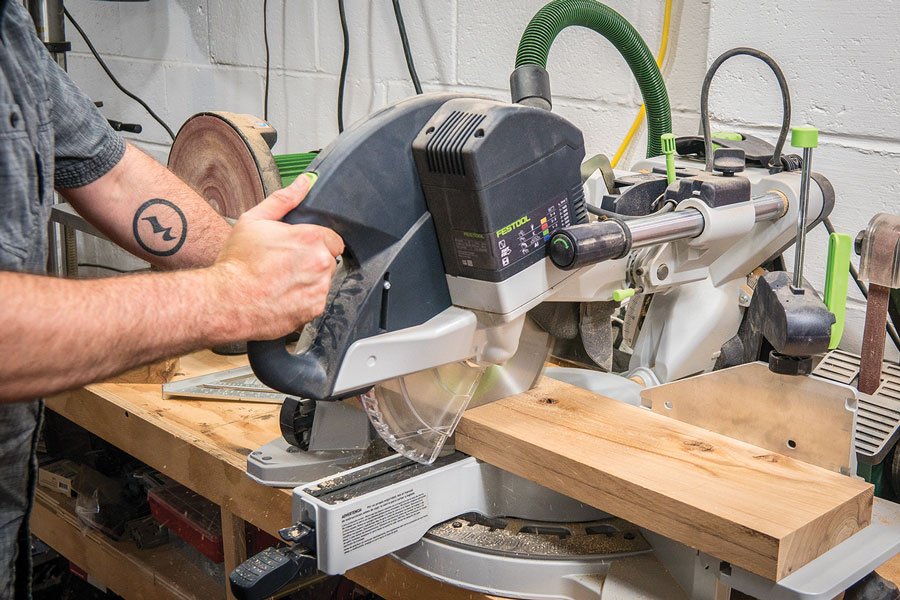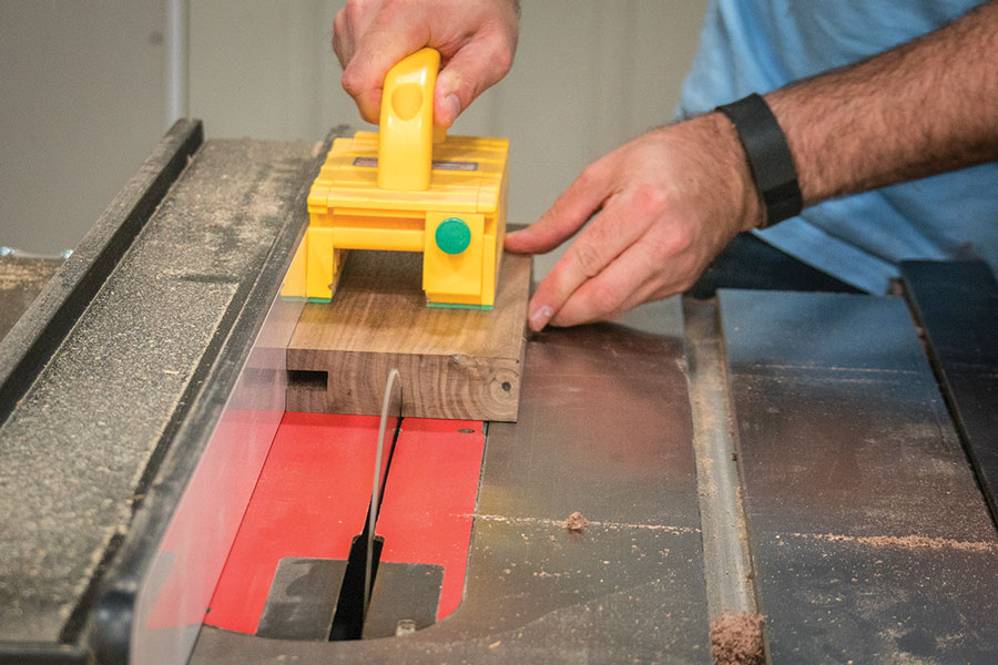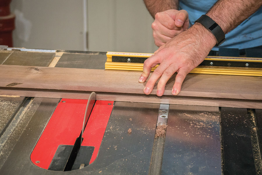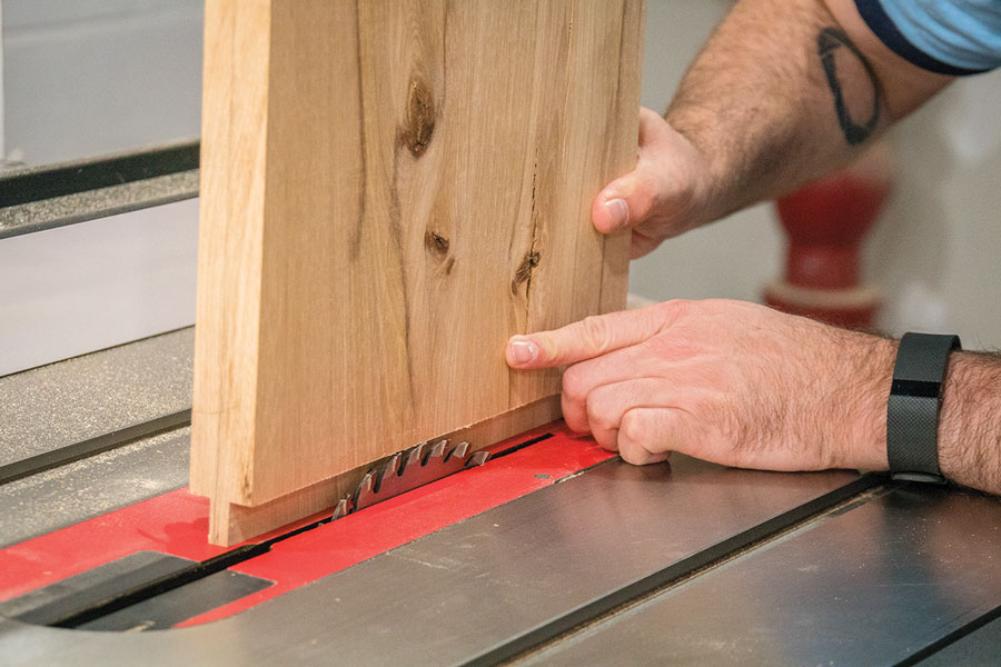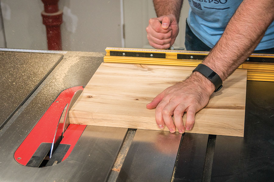 9) Crosscut the breadboard ends. Mark the width of the center panel directly onto the stock you’re using for the breadboard ends. Use your table saw and miter gauge to crosscut it to length.