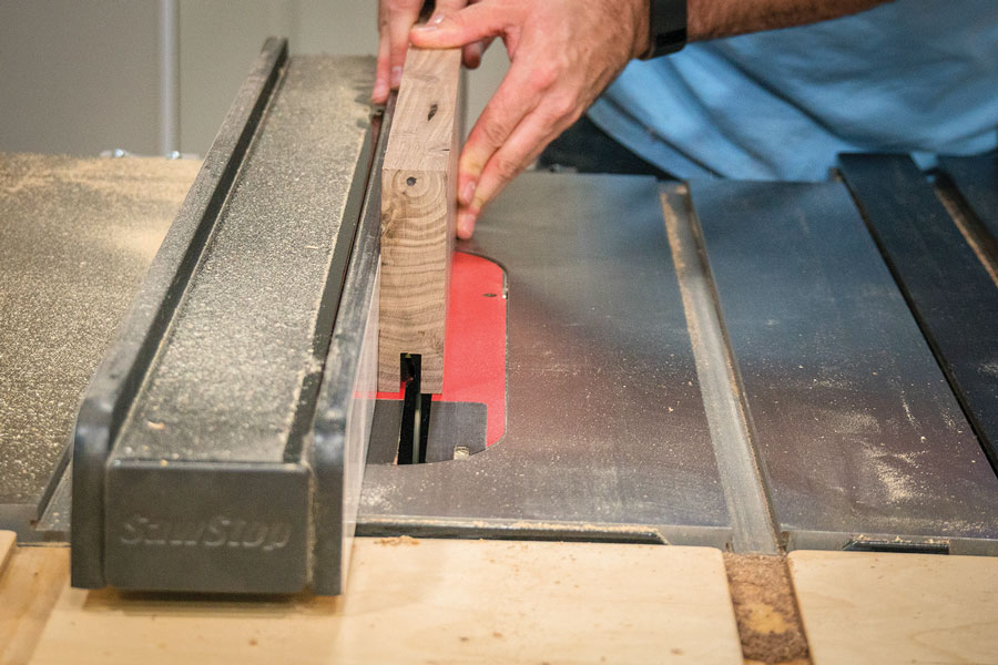 6) Cut the tongue. Position the fence 1″ from the blade (including the blade width) and raise the blade to 3⁄8″. Take multiple passes with a single blade to hog away the waste on the ends of the stock, with your last pass guided by the miter gauge but flush against the fence. Because you’re removing the same amount from each face of the panel, the tongue is perfectly centered.