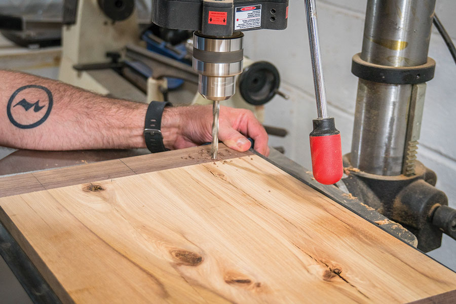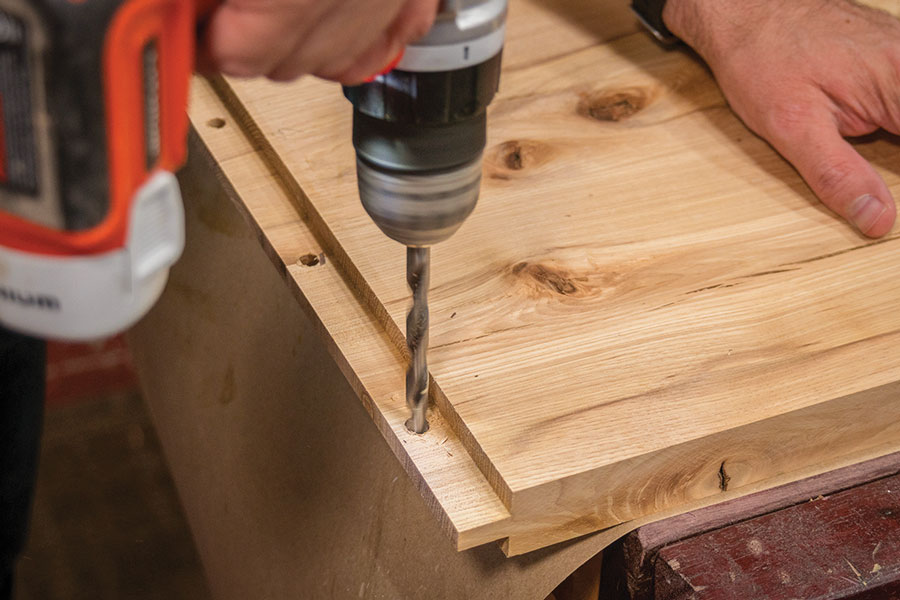 11) Prepare for pegs. Set the breadboard ends into position on the panel and drill three 1⁄4″ holes on each end. The holes should go through both sides of the breadboard end as well as the tongue on the panel.