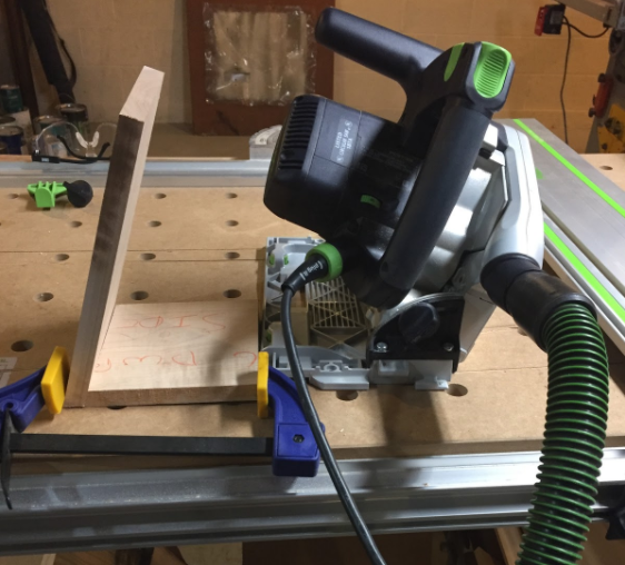 Time was of the essence, so I immediately started poking around the scrap bin. I found a maple offcut from a recent chest of drawers build and started playing with angles. I found that 20͒º looked about right so I tilted my track saw and made a few practice cuts. It took some thinking (and flipping back and forth of boards) but after making two 20͒º cuts, I lined things up as shown below.