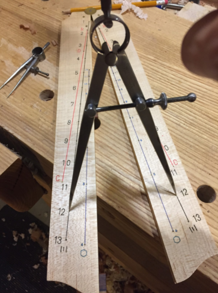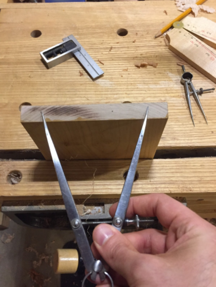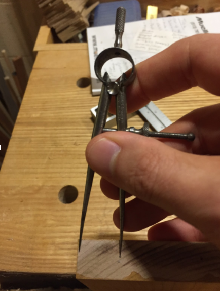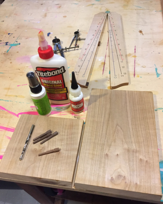 While sanding, I contemplated the best way to join the two sections together. The small walnut Miller Dowels I had lying around would add both strength and a subtle contrast to a rather simple piece. It also allowed me to bust out one of my favorite techniques: using a sector to evenly space the dowels.